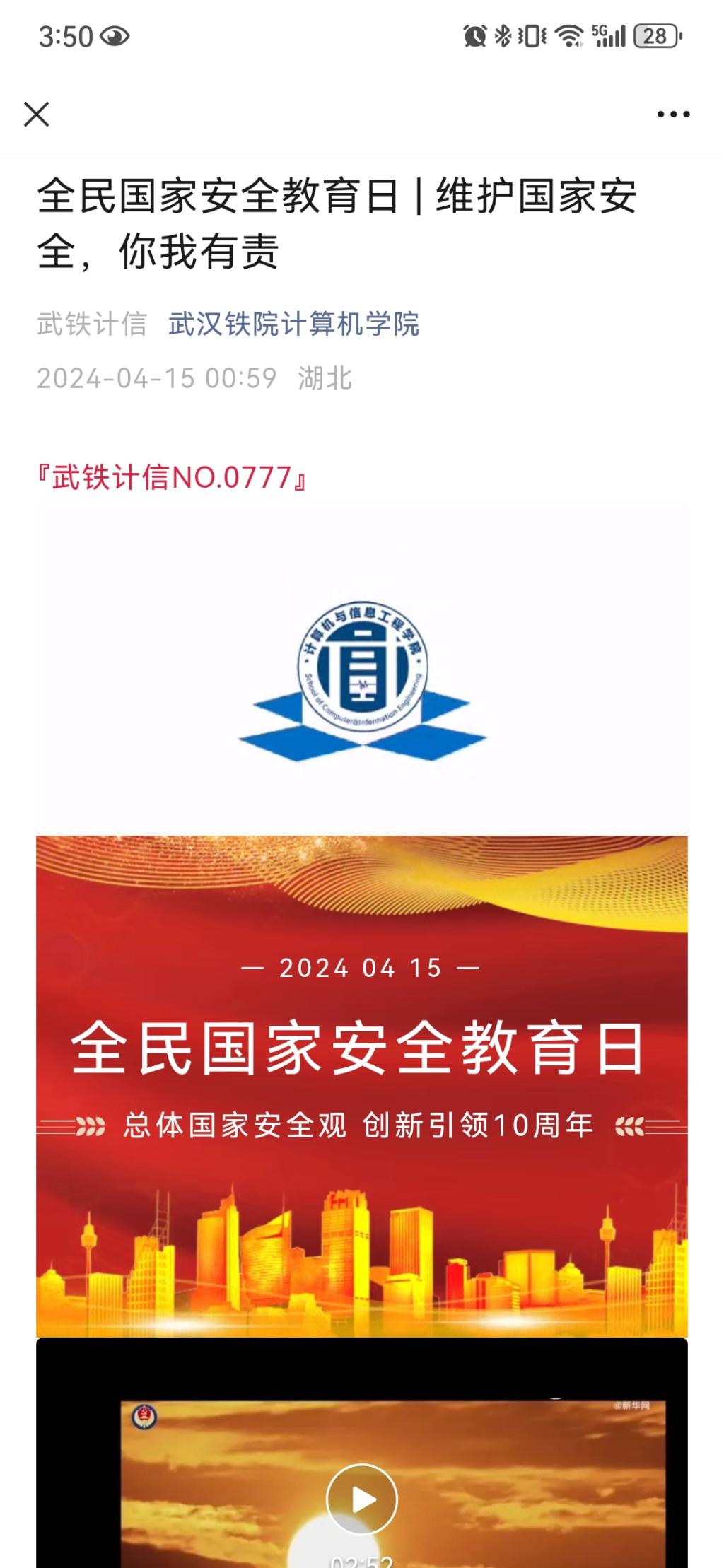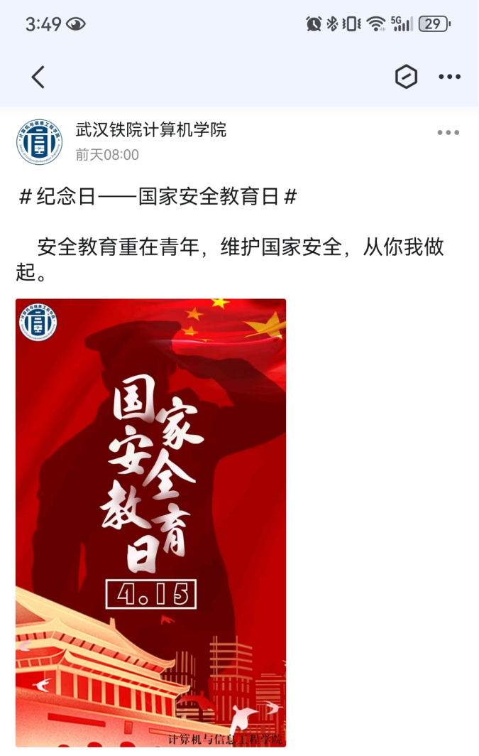 为进一步提高学生的国家安全意识,在4月15日全民国家安全教育日前后,计算机与信息工程学院组织开展了一系列国家安全教育活动,学院全体学生参与。