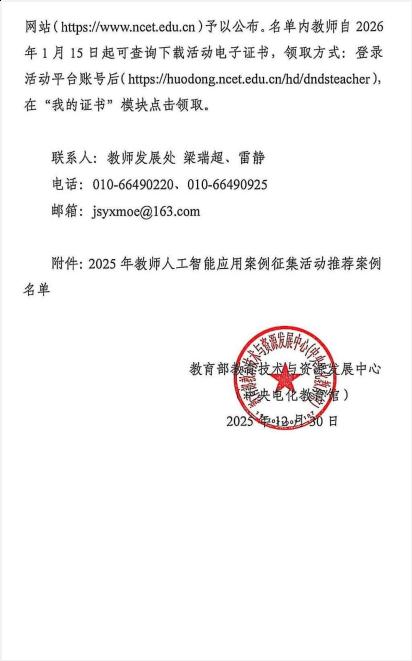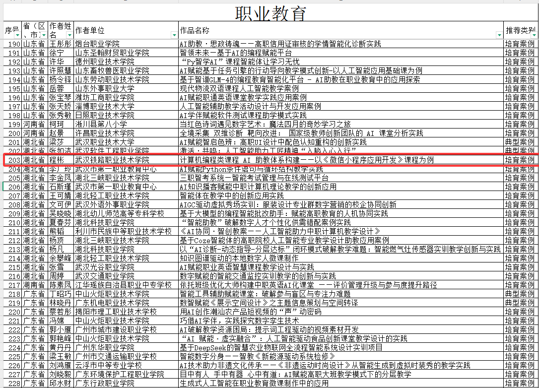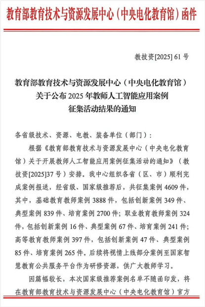 近日,教育部技术与资源发展中心(中央电化教育馆)公布2025年教师人工智能应用案例征集活动结果,今年会官网今年会程彬老师申报的《计算机编程类课程AI助教体系构建——以〈微信小程序应用开发〉课程为例》案例成功入选培育案例名单。