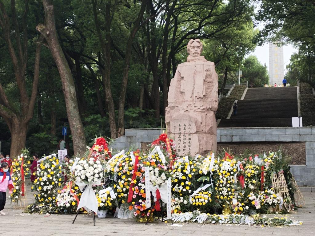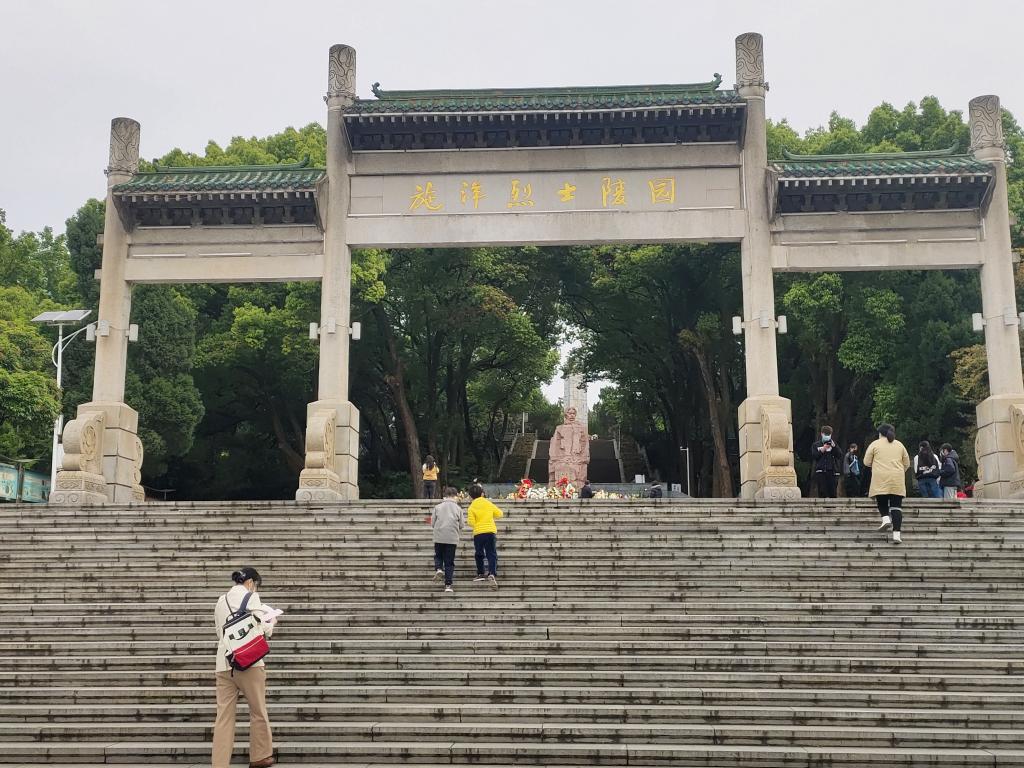 施洋烈士纪念馆位于武昌洪山南麓,安葬着烈士的灵柩。烈士塑像巍然耸立在广场中央,同学们被庄严肃穆的气氛感染。“二七工仇血史留,吴萧贻臭万千秋,律师应仗人间义,身殉名存烈土俦”,学生们在烈士碑前默哀,静静地追思。