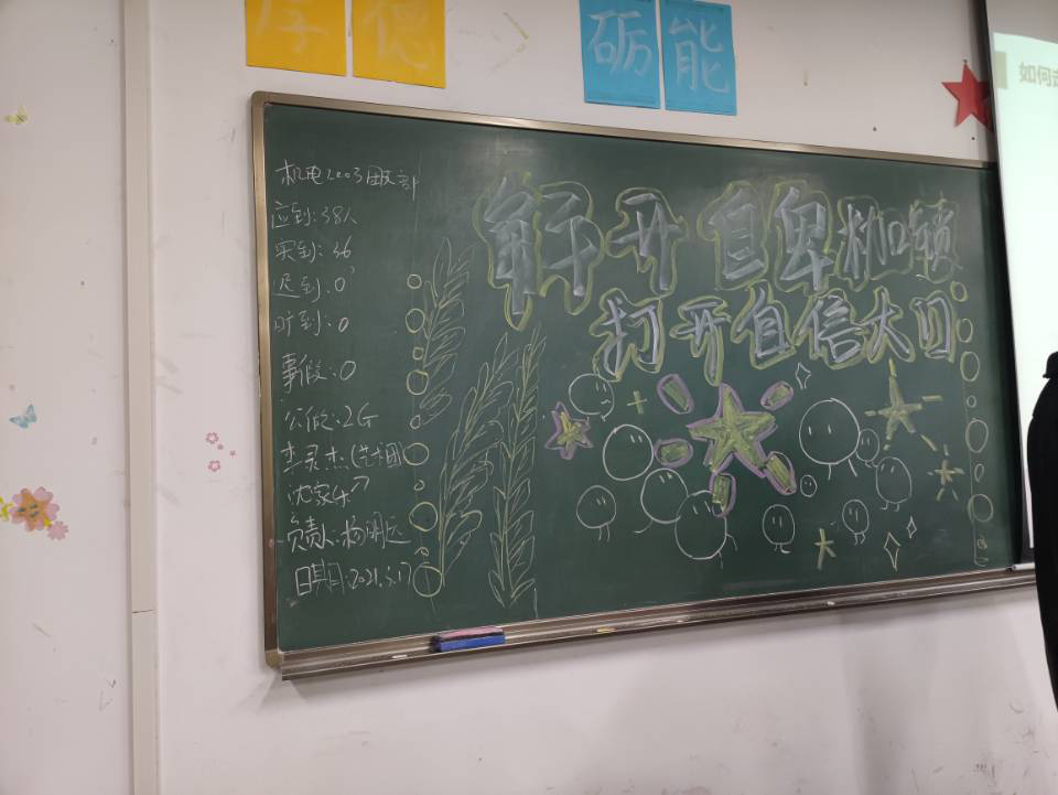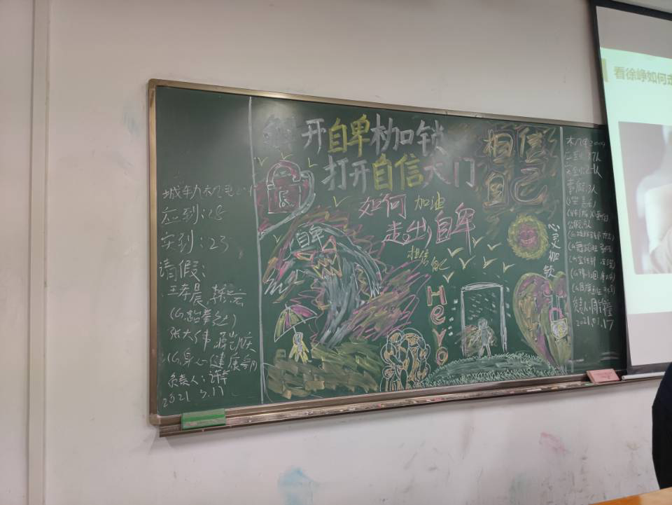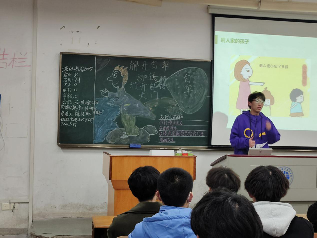 根据学工处和学校青春健康中心的工作安排,3月17日晚,机械与电子学院20级所有班级开展了主题为“解开自卑枷锁,打开自信大门”的心理班会。学生党支部书记徐旻杰、辅导员庞金巍、班主任郭艳艳老师在现场指导。