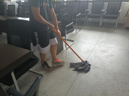 活动开始前,同学们在三栋七楼集合,部门干事分配打扫任务。活动开始后有序进入打扫场地。同学们用抹布将桌面擦拭干净,认真仔细打扫地面卫生,并将桌面上的资料摆放整齐。在打扫过程中,同学们干劲十足,积极配合,为老师同学们营造出一个干净整洁、清爽、明亮的办公环境。