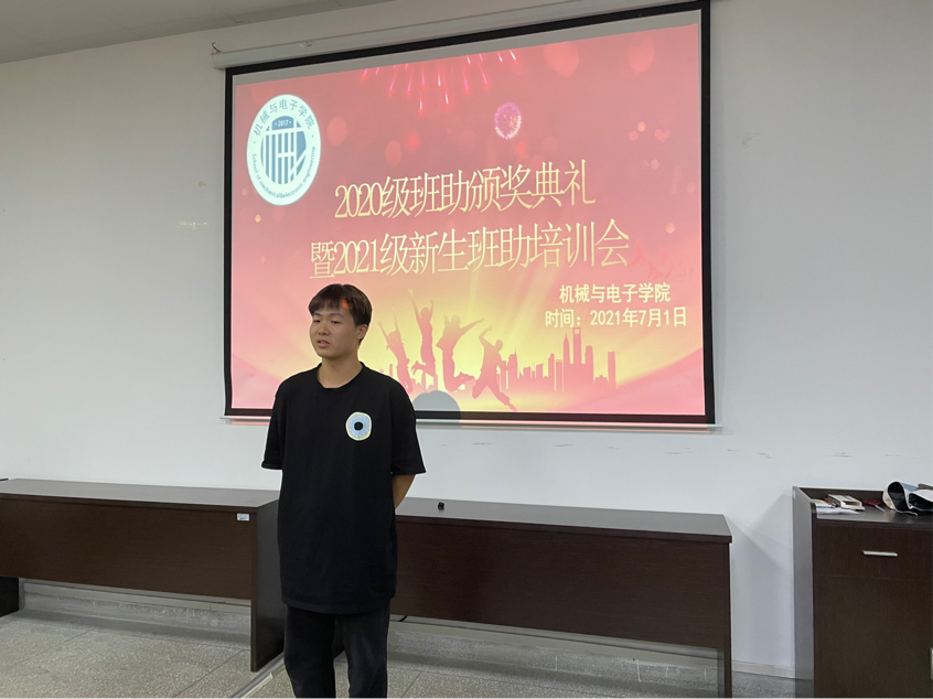 机械与电子学院于7月1日下午四点半在崇德楼702会议室举行了2020级班助颁奖典礼暨2021级新生班助培训会,办公室副主任徐旻杰,分团委书记熊珂,20级优秀班助和21级新生班助参加了此次会议,会议由分团委副书记刘行同学主持。