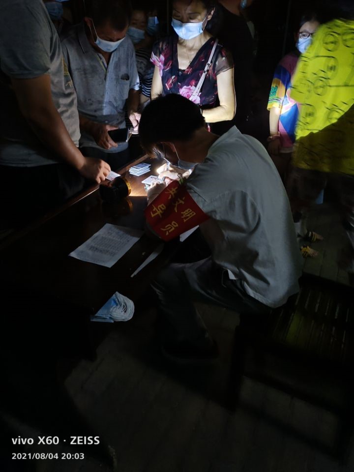 8月4日下午19点30分,在村书记的带领下,多名志愿者佩戴着志愿者袖章来到了法泗村村委员会。他的主要任务是收集村民的详细信息和排查村里各个年龄分段做打疫苗的具体情况。虽然任务看似很简单,但是却因为村民人口数目的庞大使任务变得沉重。从8月4号19点40开始到的21点才完成了当天2个队的任务,第二天的早上8点又继续来到村里进行登记,中午休息时,彭传耀同学也只是扒拉了几口饭、喝了几口水又继续回到自己的岗位上继续完成登记任务。