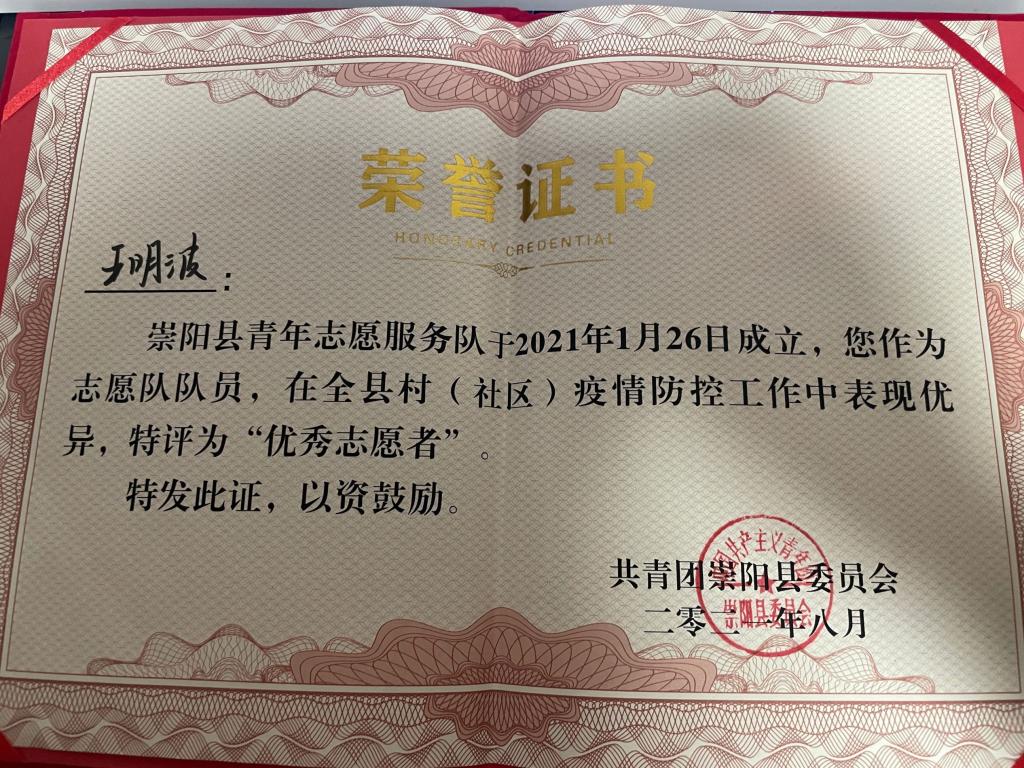 在核酸检测和防疫宣传后,最重要的任务就是卡点值守了,他带领的志愿服务队被分配到社区第二网格广发小区进行值守任务。在天气闷热潮湿14天里,志愿队对值守小区做到了进出人员全登记,返崇人员全上报,无关人员无进出的良好成绩。由王明波带领的志愿队也因此获得了共青团崇阳县委高度肯定,给予了“优秀志愿者”的光荣称号!