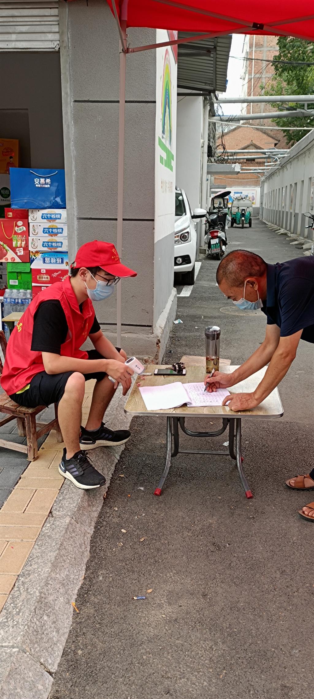 在母校志愿者的带领下,8月7日早上8点身着红马甲的任一多来到了网格划定小区门口值班,测量人员体温,登记出入人员情况。在烈日炎炎下的他并没有退缩,每天从早上八点到下午一点坚守在防疫一线,到目前为止他仍然在为抗疫做贡献。