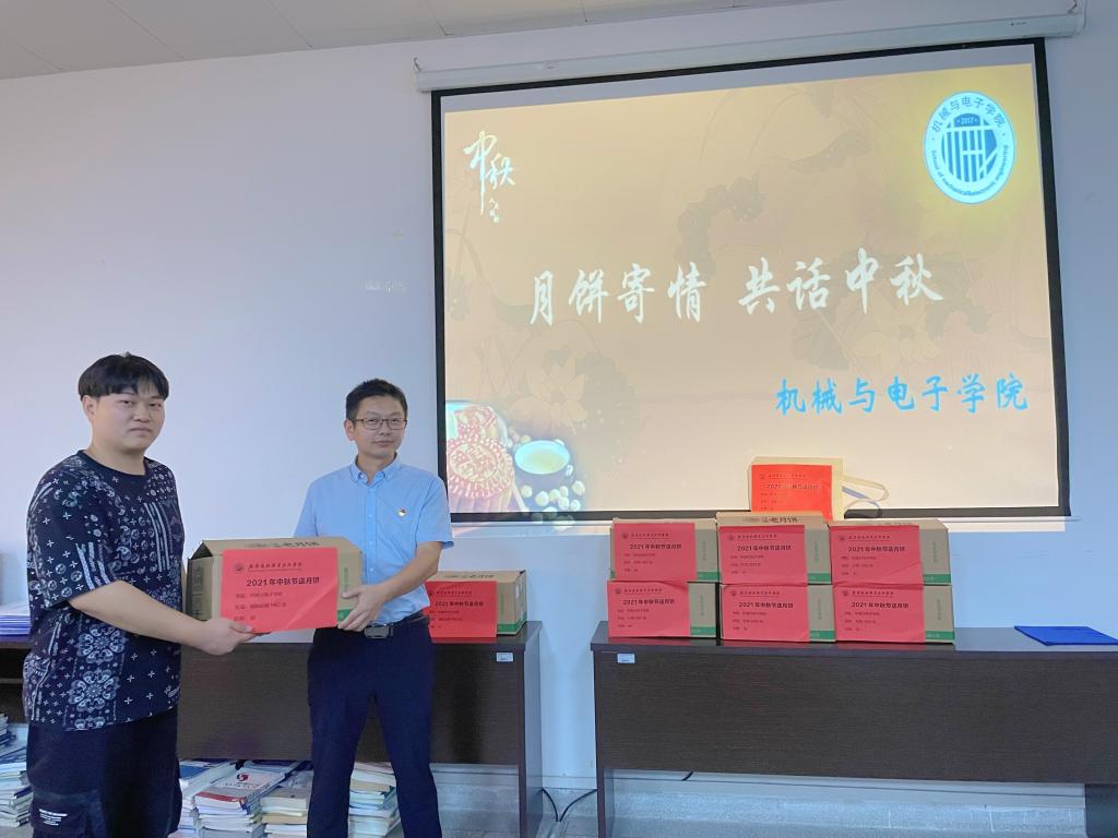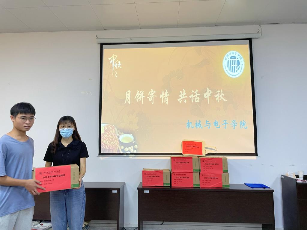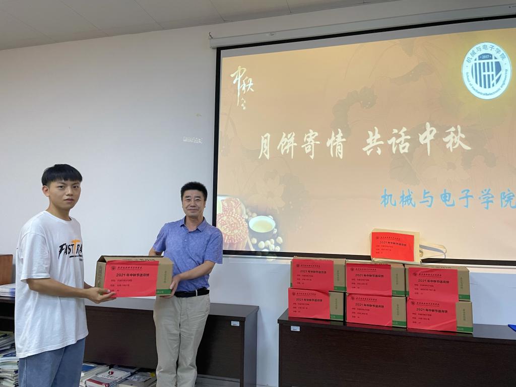20日下午,以传统节日中秋节为契机,机电学院院长、党总支书记王峰、党总支副书记张理武、副院长张辉、19级辅导员熊珂等老师,为在校的全体同学分发月饼。小小的月饼饱含学校和老师对学生的关爱,让远离家乡的学生在节日中感受到学校“家”的温暖。