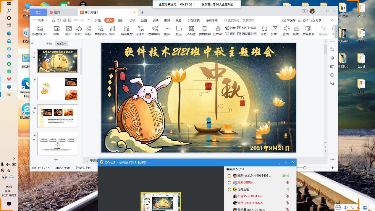 21日,正值中秋佳节,机械与电子学院为还没有来到学校的21级新生安排了线上传统文化教育专题课程(中秋特别篇)。21级全体同学在线上与班主任和班级助理积极互动,介绍自己家乡的中秋习俗,讲述中秋传统故事,分享自己拍摄的照片,进行中秋诗句接龙等活动,共同度过了一个难忘的中秋节日,这既是一次传统文化教育,也是拉近新生之间距离的绝佳机会。