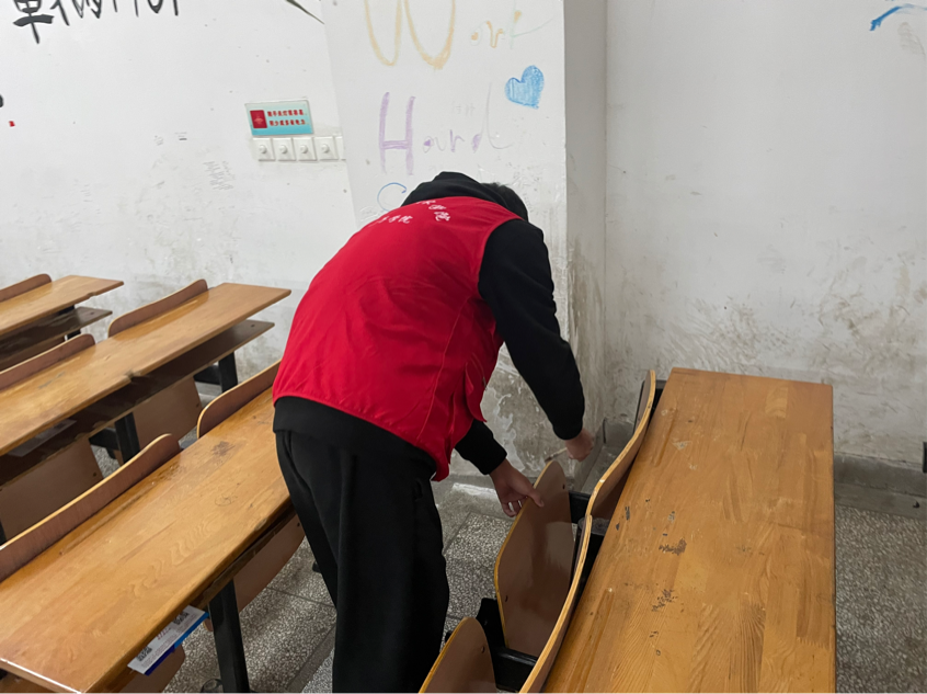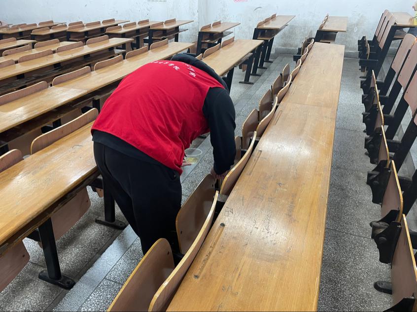 11月28日,机械与电子学院组织学生志愿者开展“教室和谐”劳动教育活动,对厚德楼一层的教室进行门、椅子涂抹润滑油。