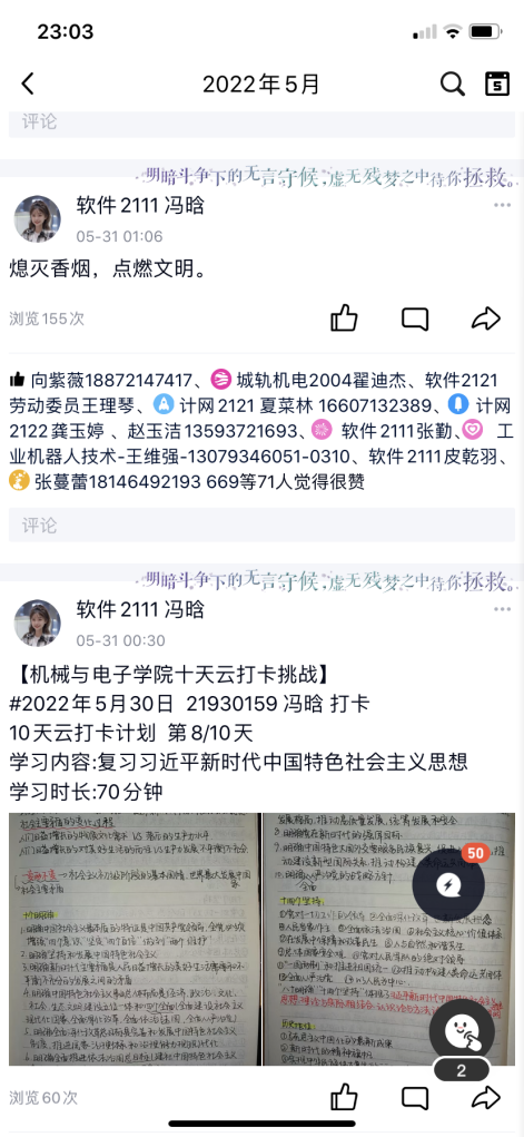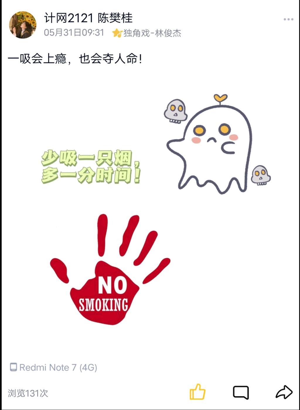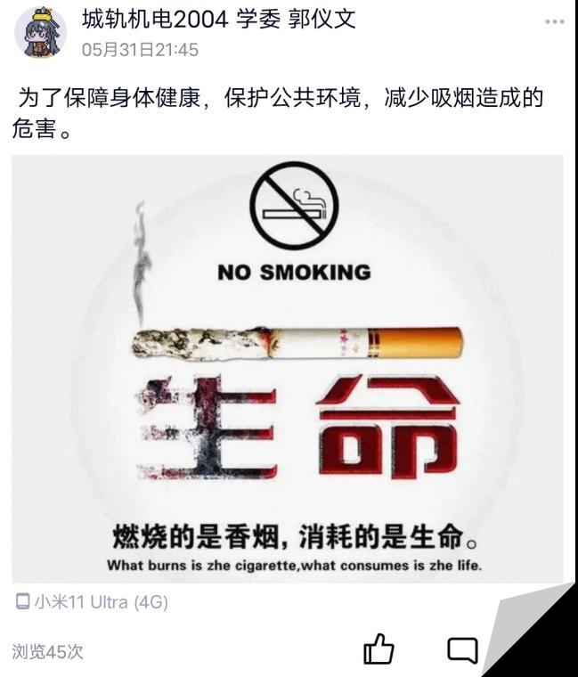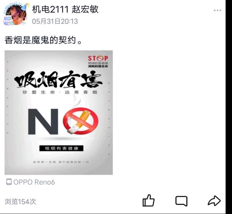 学生们通过在微博、朋友圈、QQ动态发布自己制作的宣传语、禁烟创意海报和禁烟视频,累计浏览量达40000、点赞量达18000,它们形象生动地传达了自觉抵制吸烟与被动吸烟的意识。此次活动在学生中形成了禁烟控烟的良好风气,促进了文明健康生活习惯的养成,真正让“拒绝吸烟,走健康人生路”的观念深入人心。