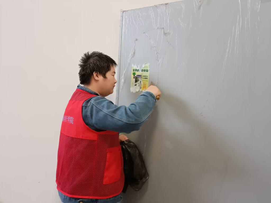 活动开始,志愿者们在三栋宿舍楼一楼集合点到,负责人分发完工具后,志愿者们便行动起来。志愿者们拿着抹布、铲刀等工具,对机械与电子学院宿舍楼和笃行楼墙体、楼道、楼梯扶手、厕所等地方的小广告进行铲除。志愿者们不怕脏、不怕累,积极主动克服困难,不给小广告留一丝“生存”的空间。