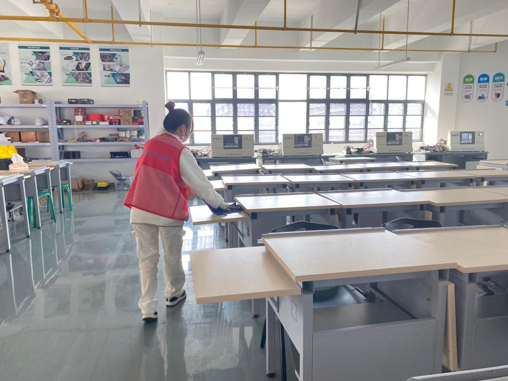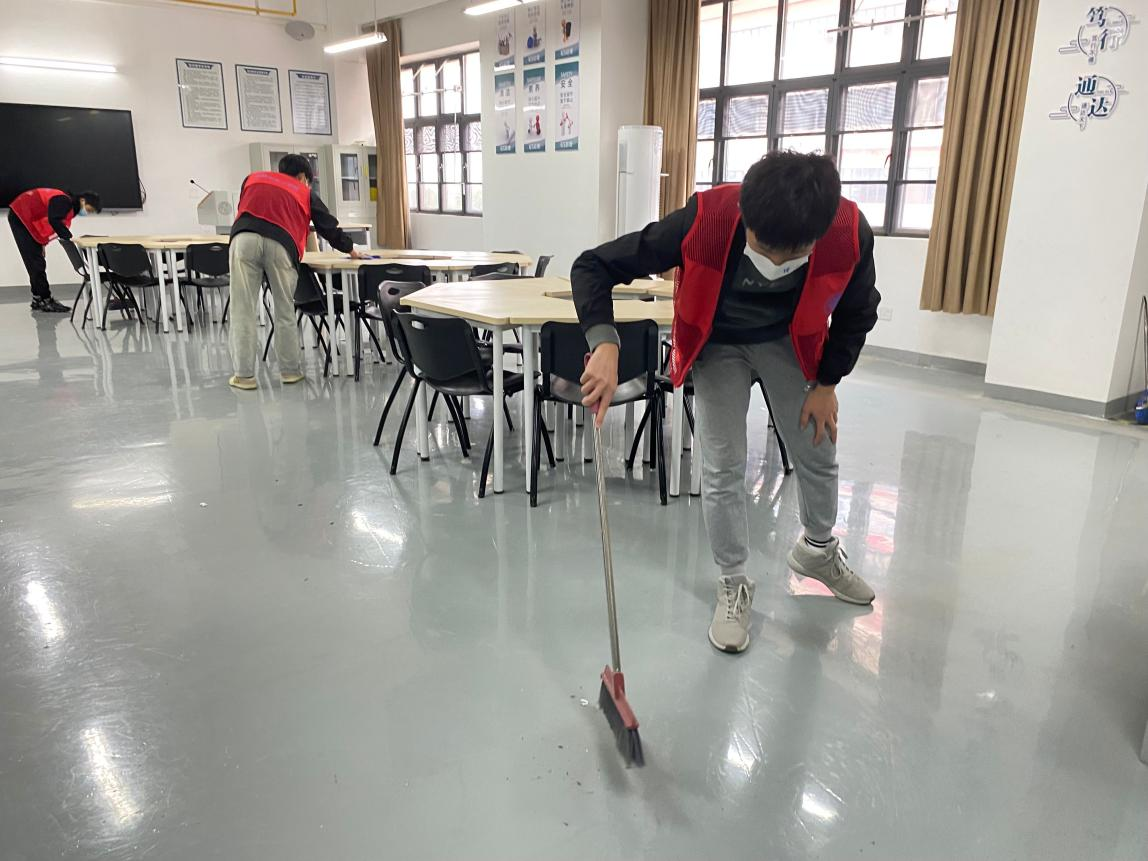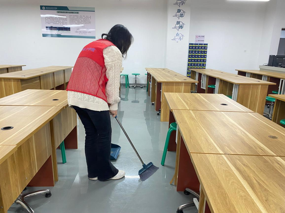 志愿者们在笃行楼一楼门口集合,活动负责人进行点到并为志愿者分发红马甲,告知志愿者们打扫时的注意事项。随后志愿者被分为不同的小组,分别对每间实训室进行清洁打扫。志愿者们们牟足干劲打扫桌面、清扫垃圾、摆放座椅,利用自己的空闲时间打扫教室,为全体同学创造了一个优美的教室环境。参与活动的志愿者在打扫过程中纷纷表示,看到实训室被收拾的十分整洁,自己的心情也变得非常愉悦,能够更集中精力投入到学习中去。
