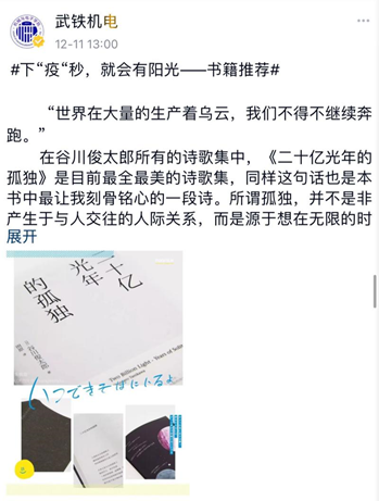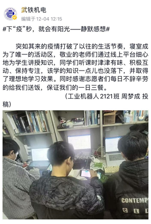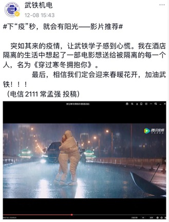 突如其来的疫情,使同学们的活动范围限于宿舍内。“下‘疫’秒,就会有阳光”活动的开展为同学们提供了一个分享平台,同学们踊跃投稿,分享自己在静默期间的的所想所感所爱,表达对老师和志愿者们无私奉献的感谢,积极推荐音乐、书籍和影视作品,营造了静默期间同学们积极向上的生活氛围,传递了阳光乐观的生活态度。