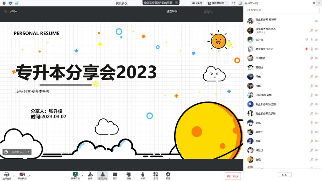 计算机学院2022届优秀毕业生冀勉和张升俊同学也在线上向同学们分享自己成功考上本科院校的备考经验、学习以及心态调整的方法,并祝愿同学们升本成功。参会同学就即将到来的专升本考试提出自己的问题,在场老师和优秀毕业生对同学们的提问进行了一一解答。
