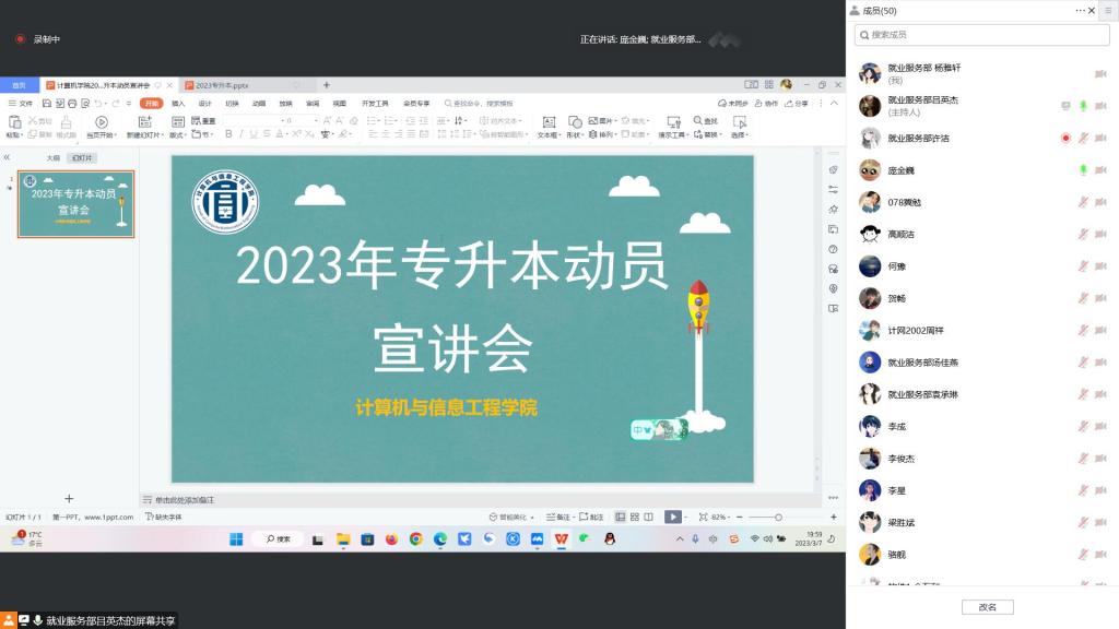 3月7日晚,今年会在笃行楼711会议室召开了专升本动员宣讲会,本次宣讲会通过线上及线下的方式共同开展。参加此次宣讲会的师生有院党总支书记、院长肖春新,副院长周方、教研室代表教师吴杰、潘登科,学院2022年成功专升本的同学冀勉和张升俊,以及学院有意向专升本的同学们,会议由学院就业专员、20级辅导员庞金巍主持。