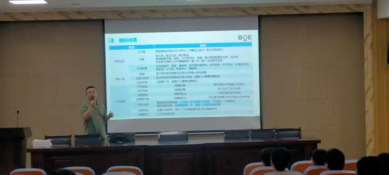 武汉京东方光电科技有限公司,成立于2017年,位于湖北省武汉市,是一家从事计算机、通信和其他电子设备制造业为主的企业。企业招聘负责人马经理从工作环境、岗位要求、薪资福利、发展机会等方面向同学们介绍了公司及其发展前景。在提问环节,同学们纷纷提出了自己的问题,马经理也耐心的为他们解答了问题,让同学们对公司有了更深一步的了解。会后,同学们纷纷投递简历并参加武汉京东方光电科技有限公司的面试,希望能在公司施展才华。