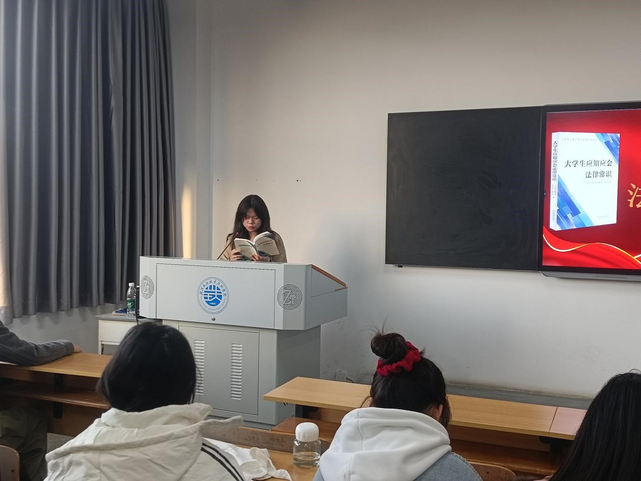 活动伊始,主持人对《大学生应知应会法律常识》一书中讲述的各篇章进行了简要介绍,由书中贴合同学们日常生活的法律案例入手,进行法律常识的讲解,进一步强调了法律知识对于当代大学生的重要意义。随后,同学们纷纷上台,通过案例分享、分析与感悟,深入探讨了与大学生生活密切相关的法律问题。分享的案例涵盖了网恋中遭遇的“杀猪盘”诈骗、偷拍他人隐私的法律后果等,这些案例的讨论不仅提高了同学们的法律意识,也增强了同学们的自我保护能力。活动最后,王梦婕老师对本次活动进行总结,强调普及法律知识对于构建法治社会、培养大学生法治思维的重要性,并鼓励同学们将法律知识运用到实际生活中,学会用好法律“武器”保护自己和身边人的合法权益。