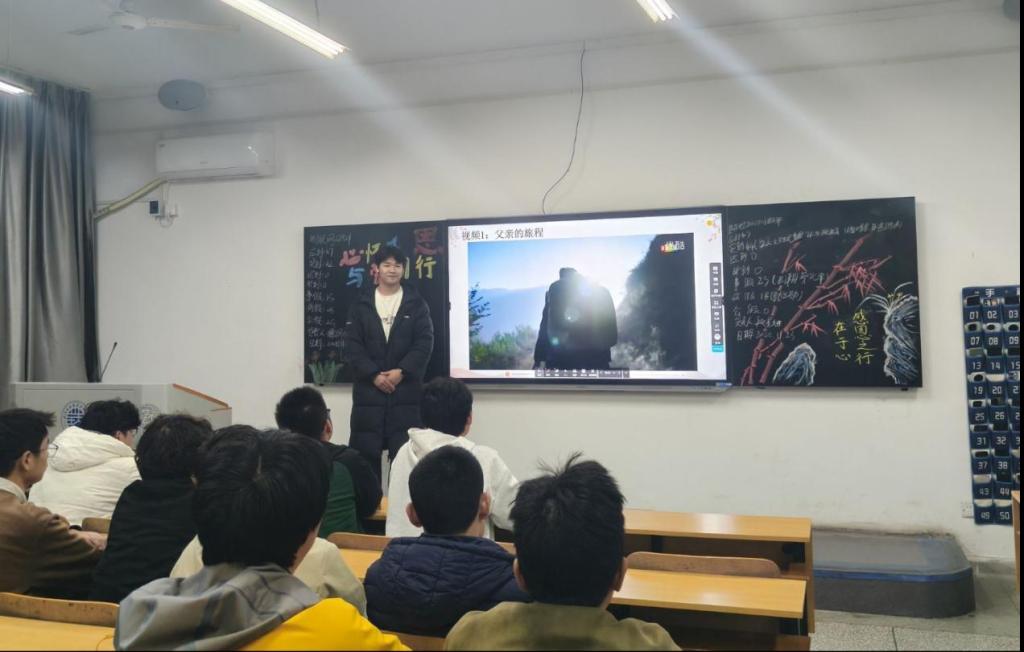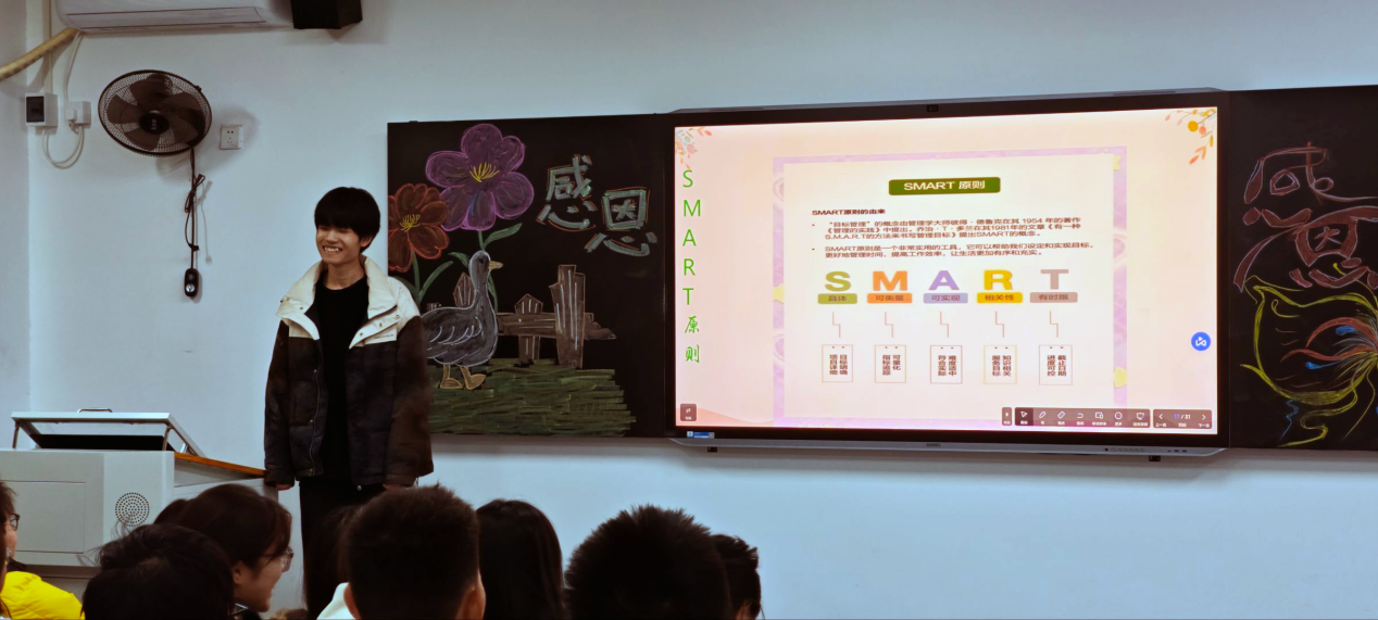 本次班会围绕“感恩引航:从心出发”与“志在追光:规划未来”两大主线展开。活动伊始,主持人从心理学视角阐述了感恩的定义与多重益处,指出感恩不仅能提升幸福感、增强心理韧性,更有助于改善人际关系、促进身心健康。接着通过观看温情视频《父亲的旅程》,同学们深刻体会到了亲情的无私与伟大。随后进行了“感恩接龙”的互动游戏,同学们积极参与,踊跃分享自己想要感恩的人与事,现场氛围温馨动人。在“志在追光”部分,活动聚焦于职业目标与自我管理。通过引入SMART原则与“生涯九宫格”等实用工具,引导学生将感恩转化为前行力量,确立清晰可行的学习与职业目标,并建立“感恩—目标”的良性循环。班会还介绍了“感恩日记”“番茄工作法”与“四象限时间管理法则”,帮助学生建立持续成长习惯,提升学习与生活的效率。活动最后,主持人对本次班会进行总结,鼓励同学们以感恩为舟、以规划为帆,在青春的航程中笃定前行,脚踏实地,心怀暖阳,真正做到“怀恩于心,不忘来处;化恩于行,明辨前途”。