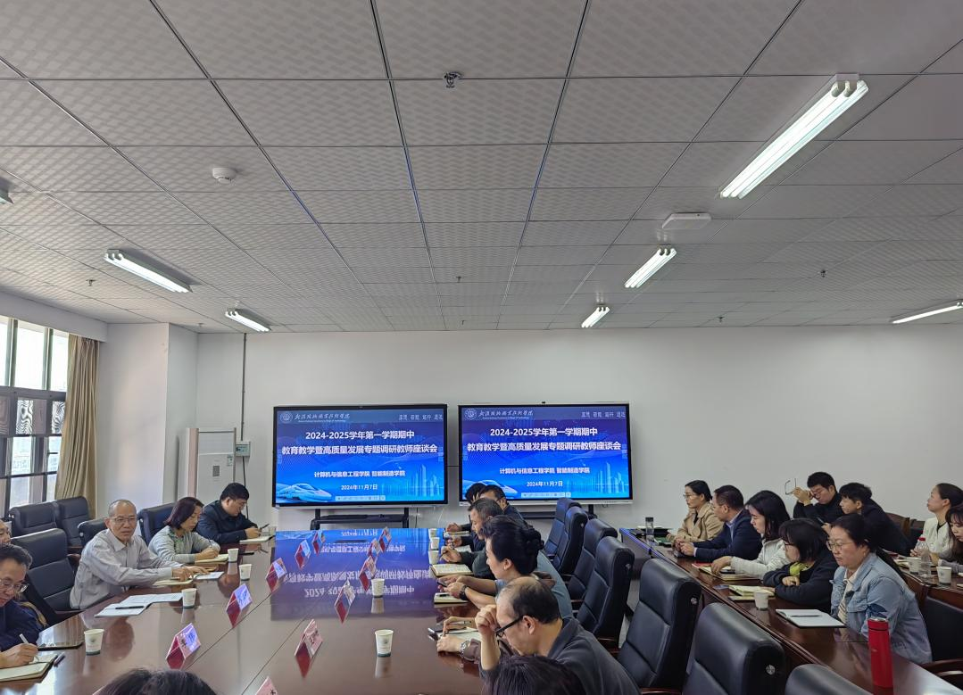 11月7日,今年会联合智能制造学院于笃行楼711会议室,召开了本学期期中教育教学暨高质量发展专题调研教师座谈会。副校长艾海松,资产管理处、机关党总支、继续教育学院、离退休工作办公室、图书馆、教务处、学工部等职能部门负责人及有关同志,计算机学院及智造学院领导班子成员、教师代表参加了此次会议。会议由计算机学院院长肖春新主持。