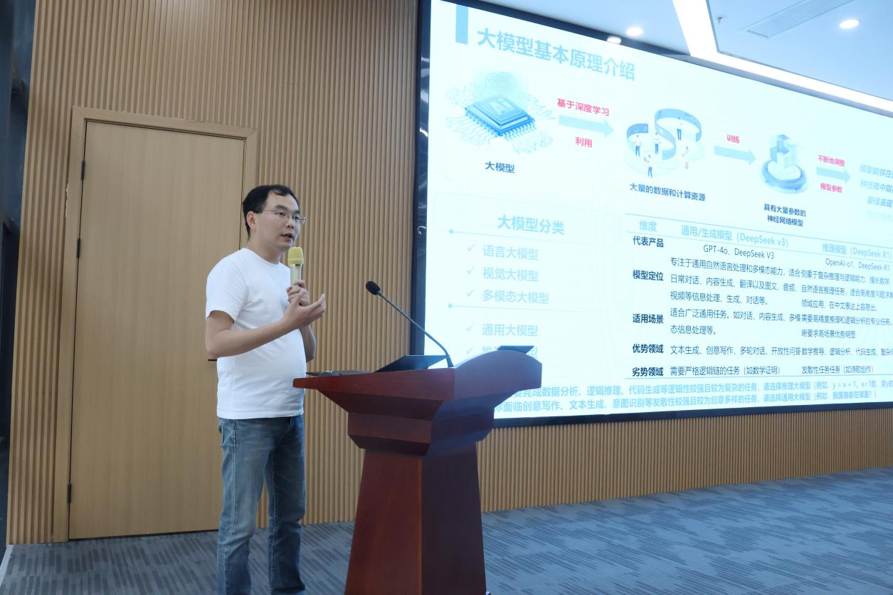 培训伊始,张伟老师以“初识AI大模型”为主题,系统介绍大模型的基础概念、发展历程以及大模型的分类。通过生动的案例,阐释了大模型如何通过海量数据训练实现智能化的语言理解和任务处理能力,并重点强调了DeepSeek作为国产大模型的技术优势,包括高效的自然语言处理、多轮对话能力和强大逻辑推理能力。张伟老师指出AI大模型正在重塑各行各业的工作方式,掌握其核心原理是迈向智能化办公的第一步
