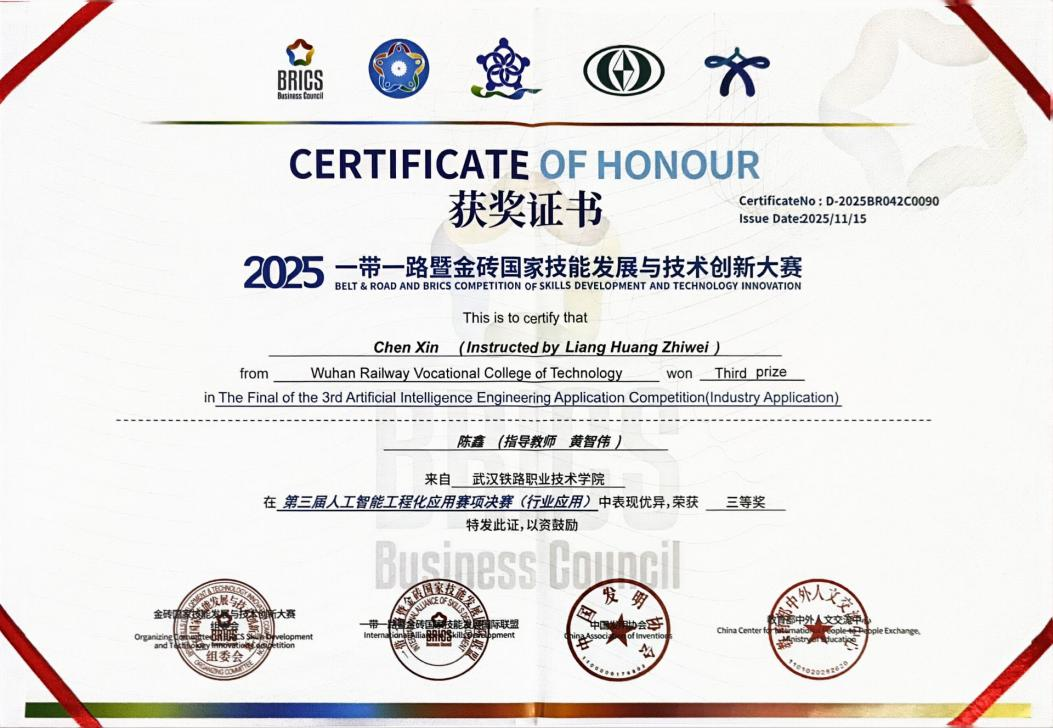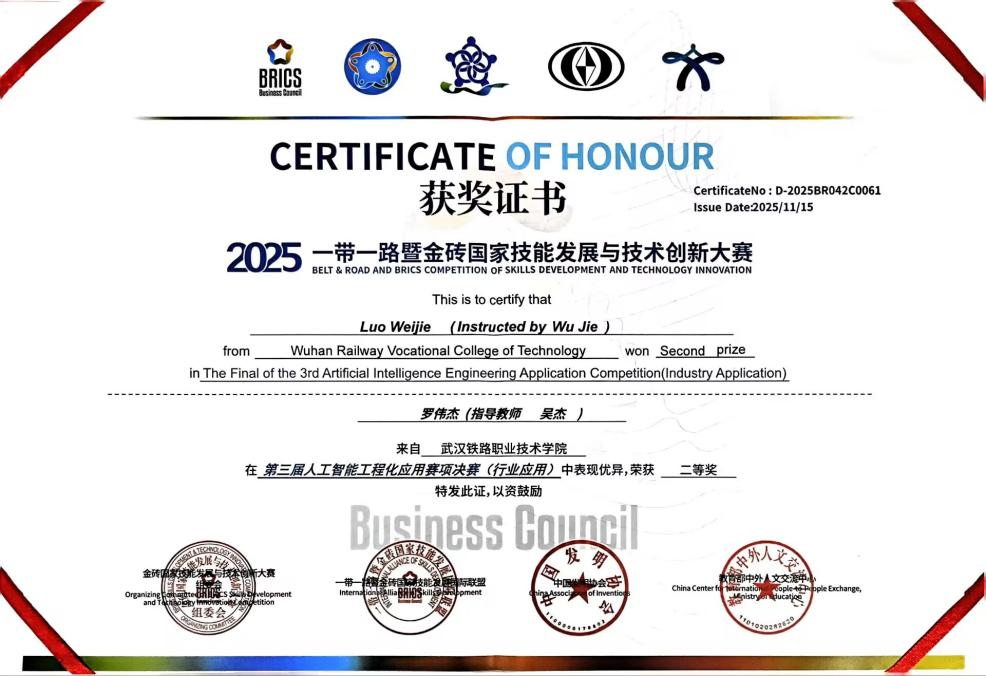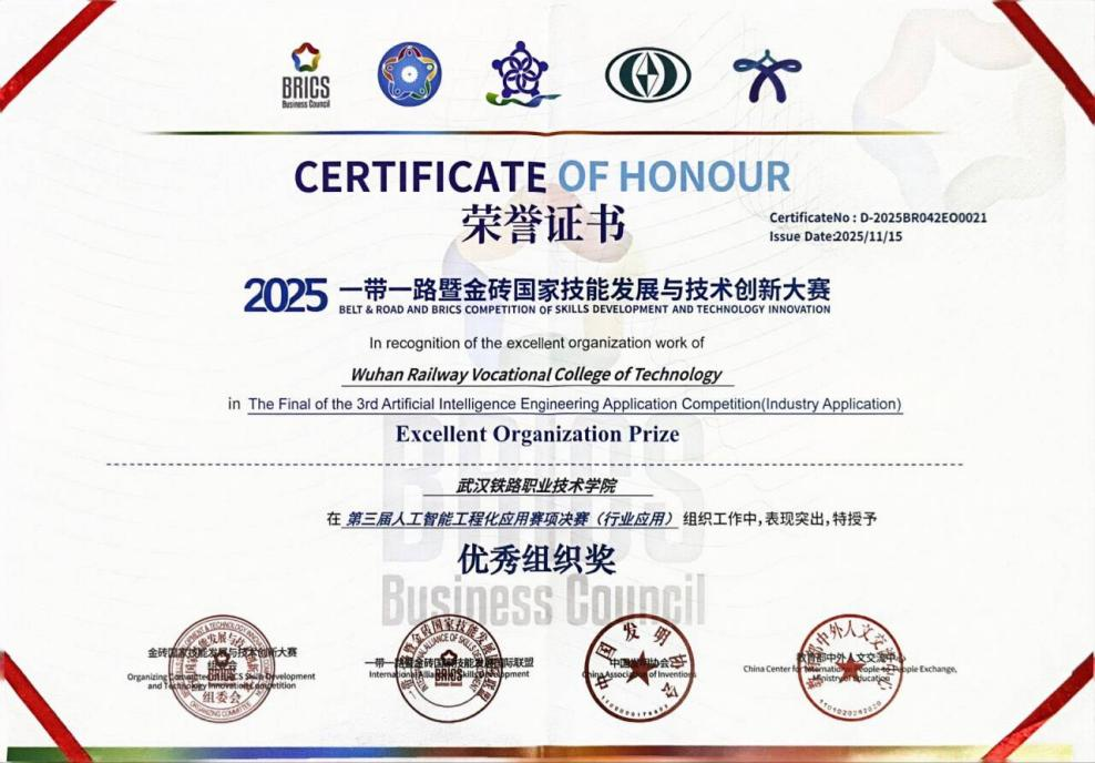 11月15日,由金砖国家工商理事会中方理事会、“一带一路”暨金砖国家技能发展国际联盟主办的第三届人工智能工程化应用赛项决赛在武昌职业技术学院落下帷幕,此次大赛作为金砖国家技能发展与技术创新大赛的重要组成部分,吸引了来自全国30个省份的150余支队伍参赛,国际化程度与竞技水平创历史新高。今年会官网计算机与信息工程学院物联网应用技术专业吴杰、黄智伟2位教师带领的2名学生组成的团队,凭借扎实的专业技能与出色的临场表现,在激烈角逐中脱颖而出,斩获二等奖1项、三等奖1项,也为学校赢得最佳组织奖。