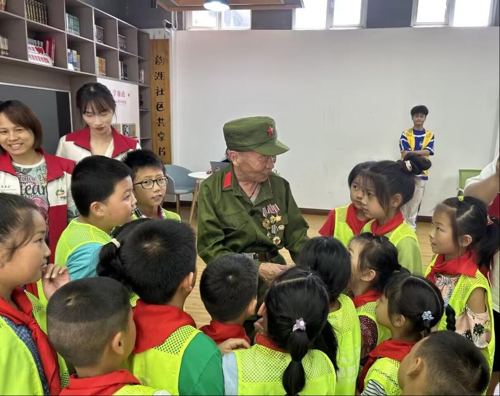 次日,炬火宣讲团邀请了69岁的抗战老兵万新汉在韵湖社区为小朋友们讲述其18年的当兵生涯。他用自己在战场上的亲身经历引导同学们追忆惜今,进一步弘扬革命精神、传承红色基因。当天,老人胸前挂满了象征一生荣誉的勋章,虽年过六旬,老人依然精神矍铄、声音洪亮地向同学们讲述着抗战生活。老英雄们为中华人民共和国的成立抛头颅、洒热血的感人事迹一次次震撼着在座的同学们。最后,同学们与万老齐唱《我和我的祖国》,在万老的歌声中仍然能听出那个年代青年人保家卫国的激情。