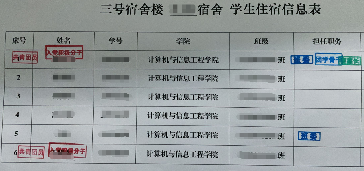 在本次活动中,对于入党积极分子、共青团员、寝室长、班委、团学骨干等优秀学生群体,计算机学院在已有的学生住宿信息表上,盖上身份标识,提醒同学们在平时注意发挥模范带头作用,号召优秀学生群体“从我做起、向我看齐、对我监督”。