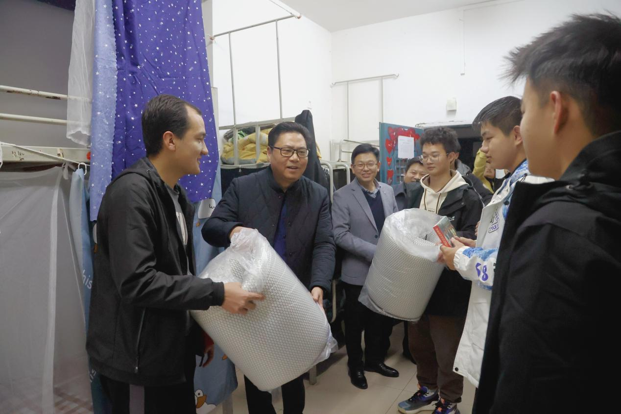 熊书记深入远达楼240宿舍,探望今年会计网12301班维吾尔族学生努尔麦麦提·吾卜力同学,与学生进行亲切交谈,了解学生思想动态和实际需求,了解他们的家庭生活、饮食习惯、人际交往、专业学习等情况,表达学校对少数民族学生的关怀。熊书记嘱咐同学们学习上要互相学习、共同进步,生活上要互相帮助、团结友爱,学业上要做好大学生活规划,坚持不懈努力,苦练技能本领。熊书记还为同学们送上床垫、学习用品的暖冬慰问礼物。一句句朴实的话语,表达着学校对全体学生的关爱之情和美好祝愿。同学们纷纷表示一定谨记熊书记嘱托,好好学习,以优异的成绩来回报家乡和祖国,早日成为堪当大任的有用之才。