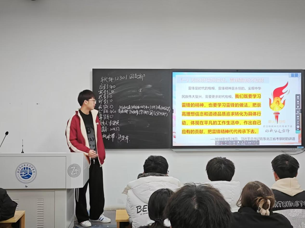 活动伊始,主讲人通过讲述雷锋生平事迹和观看雷锋原声视频作为切入点,带领同学们走近雷锋身边,沉浸式感受雷锋精神的深刻内涵。同时主讲人引用雷锋和新时代雷锋精神践行者的故事,引导同学们要从平凡事迹中挖掘雷锋精神的时代特征,用事迹激励大家从身边小事做起、从现在做起,积极参加校园志愿服务活动,用实际行动彰显青年担当。随后,主讲人与同学们共同研讨关于雷锋精神的话题,引发同学们深思并踊跃发言,讲述自己所了解雷锋同志的先进事迹,介绍自己身边学习、践行雷锋精神的优秀榜样以及开展深入贯彻雷锋精神主题的实践活动,展示身边的雷锋风貌。