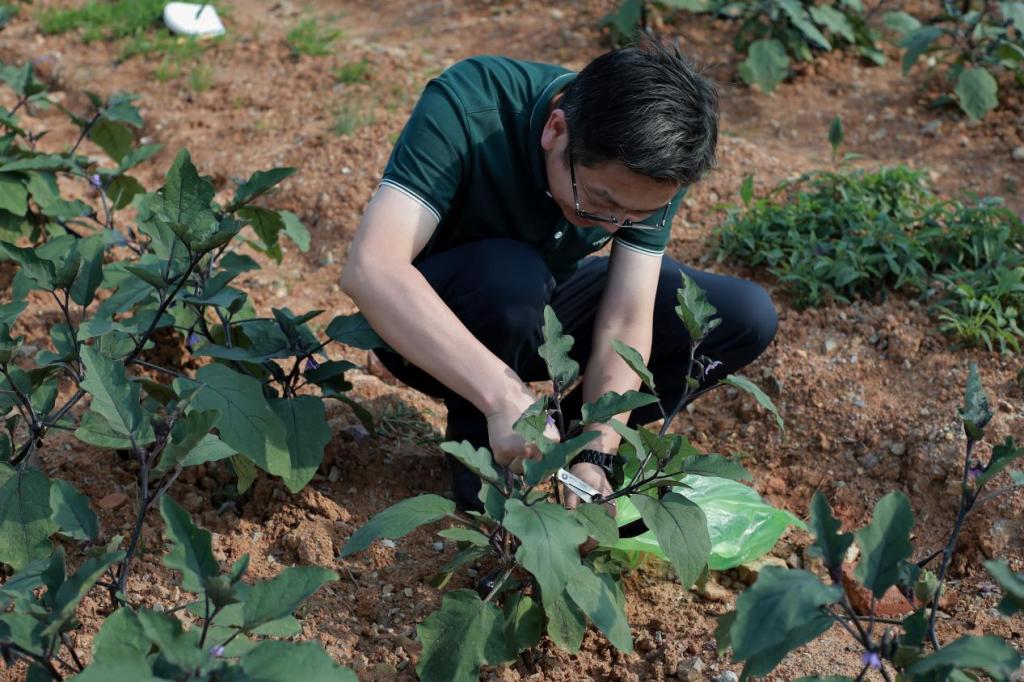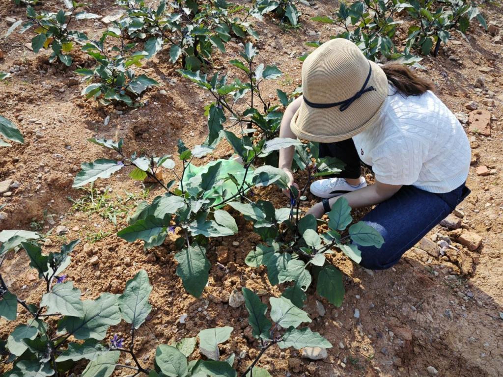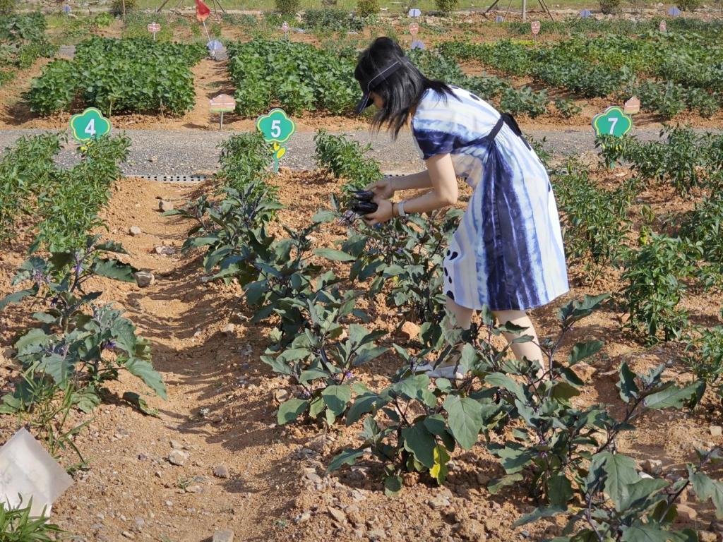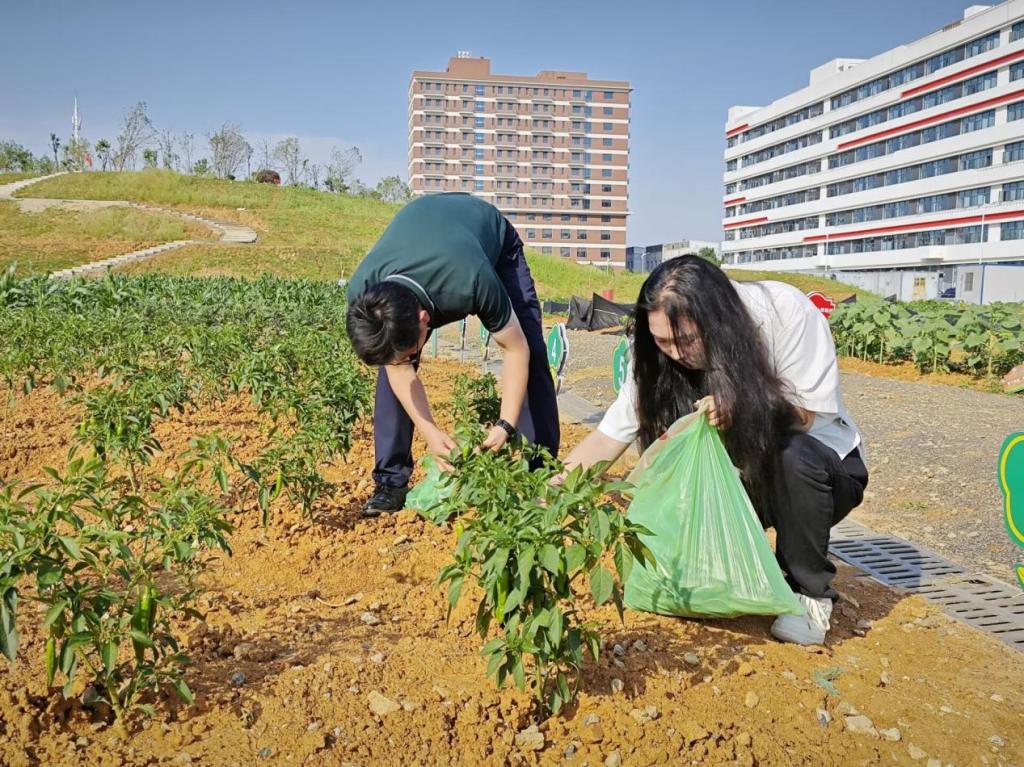活动伊始,同学们在老师的带领下去到农场,一眼便望到绿油油的蔬菜地,挂着沉甸甸果实。经过两个月多月的精心灌溉与呵护,长长的、绿绿的辣椒成熟了!亲历劳作过程,劳动成果如今一一呈现,大家感叹“果然大自然就是最生动的教材!”大家都拿着采摘工具,纷纷跃跃欲试,迫不及待地下到农田里准备大展身手。张理武书记连忙提醒道,“见到我们种下的菜长得这么好,结果率也高。我们都很高兴,但同学们别心急,这采摘跟种植一样可是大有讲究的,你们看这茄子的茄帽上面长有小刺,采摘时我们就要避开小刺,握住茄身,不能直接拧,要用剪刀剪断茄柄,否则会拧伤枝条。”话落,一个肥硕的茄子就落在了张书记手里。张书记亲自向同学们示范着正确的采摘方法,确保学生的安全和采摘的品质,同时他告诉同学们这些蔬菜可以做出哪些美味的菜肴以及它们的营养价值。在采摘过程中,同学们亲手摘下了茄子、辣椒等蔬菜,感受清理石块、改良土壤、精心种植的辛勤劳动后丰收的喜悦。一位同学感叹到:“我们‘开心农场’种植的都是有机蔬菜,没用任何农药,安全绿色,纯天然无公害,保证是吃的开心、吃着放心。”另一位同学说道:“从耕地到播种,再到浇水施肥,一步步参与着、见证着它们的成长,忽然就到了采摘的时候,真是感受颇多,收获满满。”