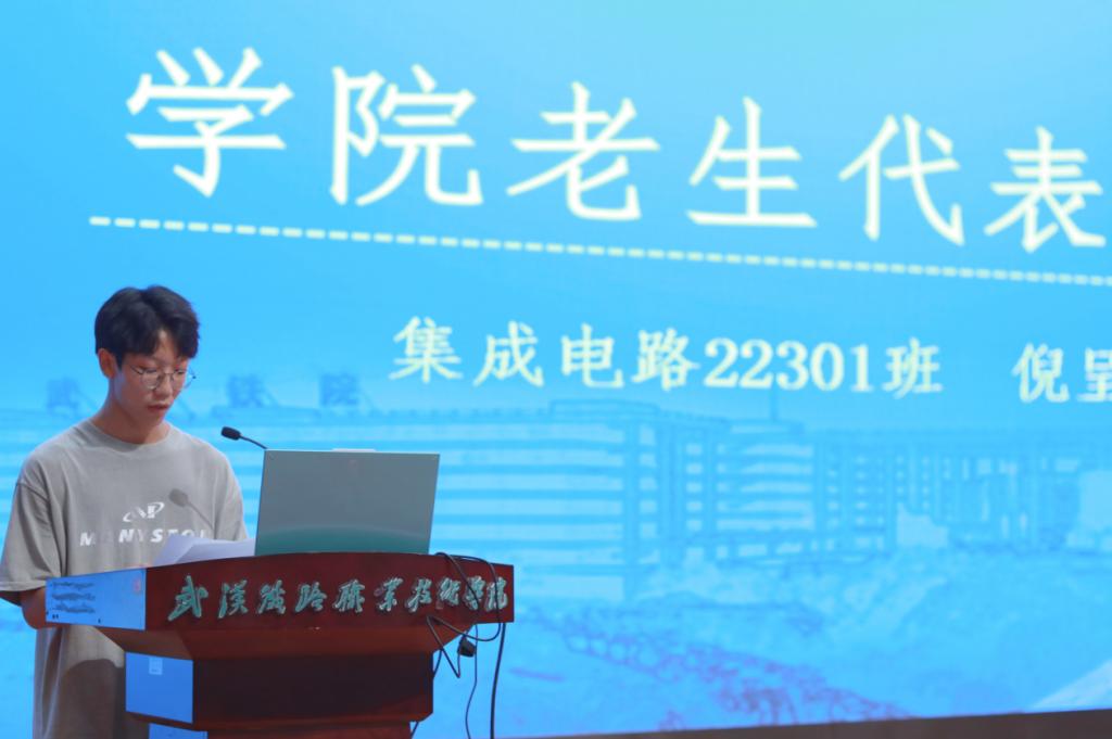 开学典礼在雄壮的国歌声中拉开帷幕。随后,集成电路22301班倪呈研同学代表老生发言,他以铁院精神为引,分享自己在武铁的收获与成长,鼓励新生们注重培养个人优秀品质。新生代表物联网12401班时鹏举同学表达了初到校园的激动以及对大学生活的期待,分享了自己大学三年的目标规划,并提倡同学们充实过好每一天。辅导员王丽老师在发言中强调,作为当代青年,新生们应具备责任感和担当精神,勇于面对挑战,实现知行合一,并常怀感恩之心,回馈家长、母校和社会,她对全体新生在武汉铁院的未来寄予厚望,并送上了诚挚的祝福。肖春新院长指出,武汉铁院是同学们人生新篇章的起点,挑战与机遇并存。他鼓励同学们客观认识自我,设定长远目标,并为之不懈努力。同时通过分享两位优秀学长的成功案例,激励新生们不断学习,掌握专业技能,创造属于自己的精彩篇章。开学第一课在张理武副书记的讲话中正式开始,张书记从认识大学、认识自我、发展规划、管理要求四个维度,深入阐述了大学生活的意义和学习的重要性。他强调,新生们应拓宽视野、培养宽广胸怀、热爱学习和生活,以青年人的活力与朝气迎接人生的不同阶段。