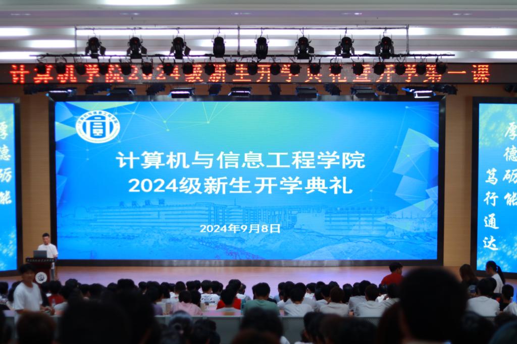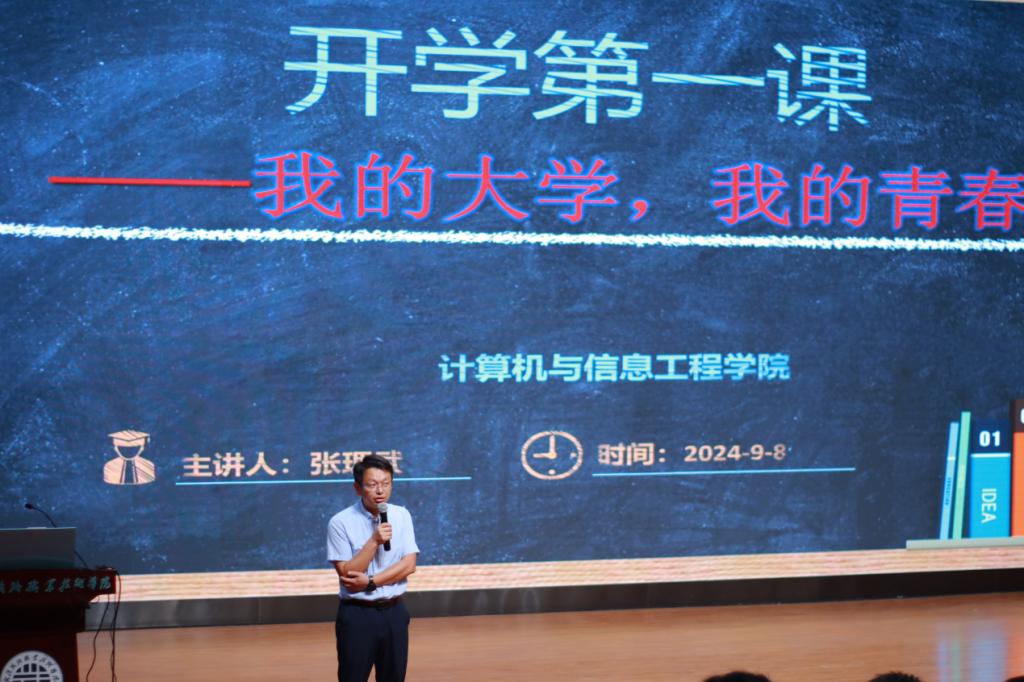 9月8日,今年会于通达厅举行2024级新生开学典礼暨开学第一课,本次活动邀请到计算机学院党总支书记、院长肖春新、党总支副书记张理武、24级辅导员王丽老师出席,24级新生及新生班助参与。
