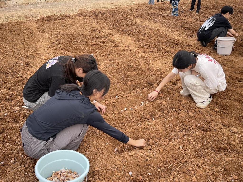 活动伊始,同学们有序前往物资处领取劳动工具,一切准备工作就绪,学生们满怀期待抵达开心农场,踏上农耕之旅。现场的老师们也积极参与到学生的劳动实践中,张理武副书记为同学们示范正确的翻土和播种方法,给同学们讲解农耕知识和劳动实践的意义。同学们热情高涨地投入到劳动中,有的负责翻土、有的负责播种、有的负责捡拾杂物,他们分工明确,配合默契,有条不紊的开展劳动实践。在耕种过程中,一名耕作经验丰富的24级新生被大家纷纷“认师”,这名“小师傅”倒也认真的指导大家翻土、播种,亲切的交流让现场气氛更加轻松愉快,同学们在田间挥洒着汗水,脸上却洋溢着灿烂的笑容。