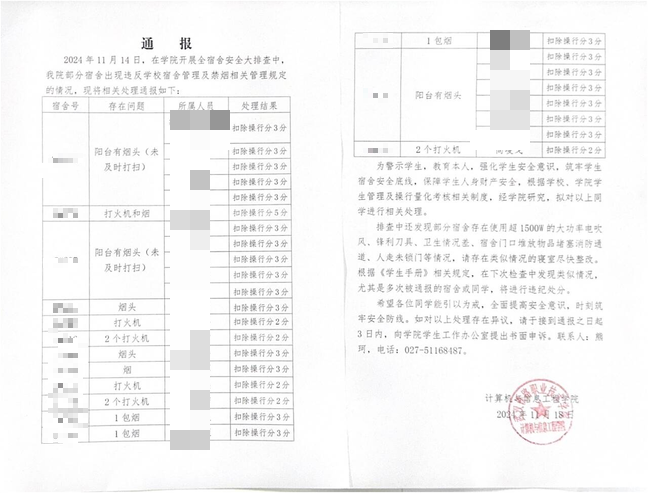 在宣传教育的同时,在学院相关老师的指导下,组织远达楼学生自律委员会成员多次开展宿舍文明行为大排查工作,主要包含每周一次的常规检查和每半个月一次的突击检查。同时,在晚查寝过程中,远达楼自律委员会成员们积极向同学们传达禁烟的重要性和紧迫性,进一步强化同学们的禁烟意识。
