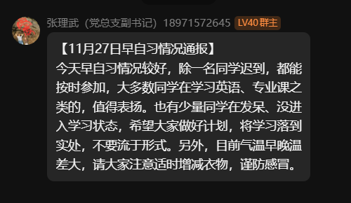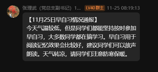 党总支副书记张理武每日巡视24级学生的早自习情况并及时通报相关情况至年级大群。为提高同学们早自习的学习兴趣,学院鼓励学生们在早自习时大声朗读,不局限于语文科目,还可以自由选择阅读材料。每日的早自习通报不仅为学生们树立了良好的学习榜样,激励大家更加投入地学习,更为同学们营造了一个积极向上的学习氛围。