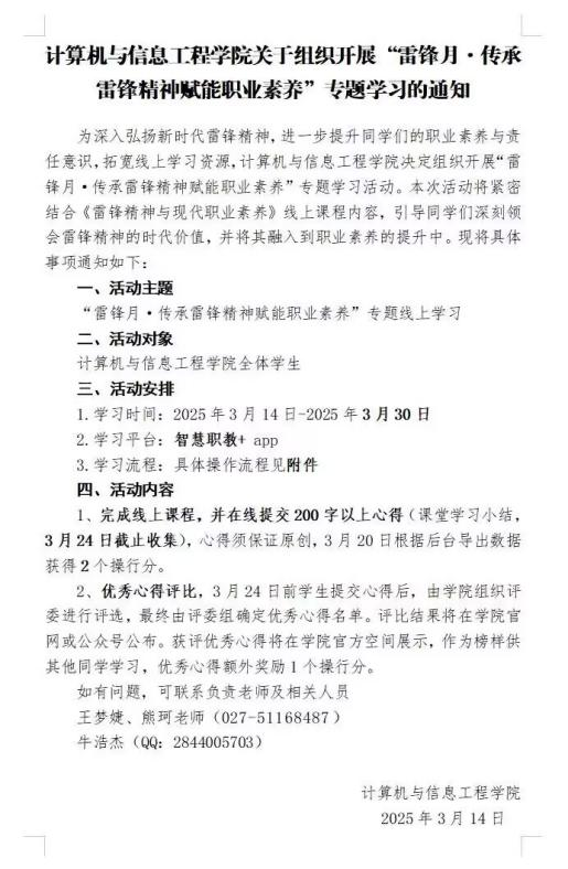 学院以“雷锋精神与现代化职业素养”为主题,组织了系列学习活动,将雷锋精神与职业素养教育相结合,引导同学们学思用并举、知行信统一。