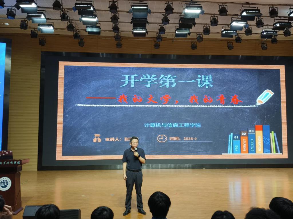开学典礼结束后,党总支副书记张理武以“我的大学、我的青春”为主题,从认识大学、认识自我、发展规划、学校管理四个方面为同学们带来了别开生面的大学第一课。在讲述中,张理武副书记以生动幽默的语言,向同学们介绍了大学的本质意义,鼓励大家走出舒适区,积极参与大学社团与学科竞赛,在实践中锤炼自我,引导同学们尽快融入大学生活,树立正确的价值观与人生观,明确奋斗方向。此外,他还深刻解读了学校的规章制度,强调了规则意识和自律精神的重要性,帮助新生在学校中筑牢行为规范底线。课堂尾声,张理武副书记寄语同学们在大学生活中“学业前程繁花似锦,在计算机学院这片沃土上绽放青春光彩!”