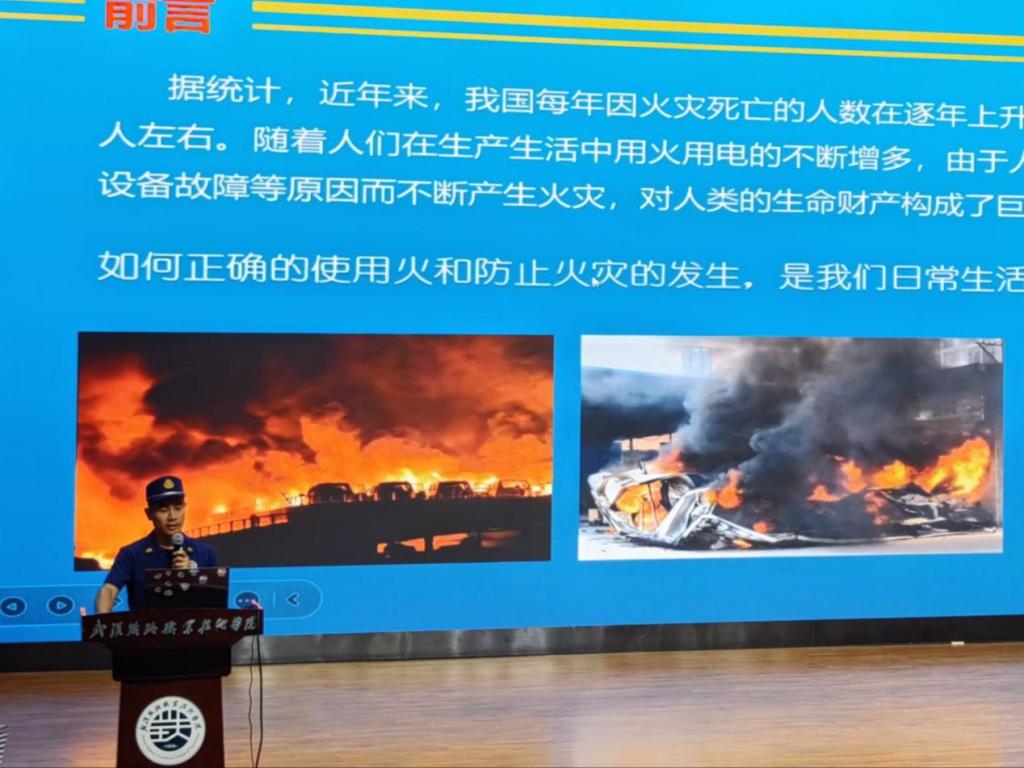 讲座首环节聚焦消防安全。消防员付坤从触目惊心的数据入手,以切合学生实际的案例素材,从消费基本知识、消防设施器材标志及使用方法、发生火灾时的处理方法及自救逃生等方面,深入浅出地讲解了火灾隐患的预防与应对策略以及发生火灾时的正确应对措施。通过向同学们普及专业消防知识,同学们强化了消防安全意识,提升了消防技能。