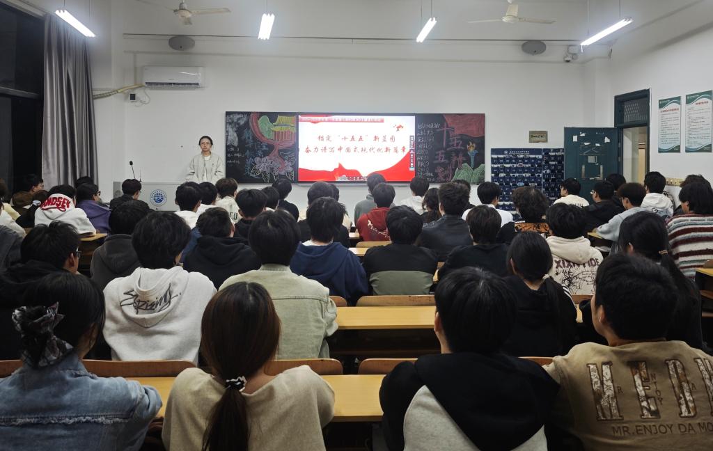 活动伊始,主持人通过PPT展示的方式,以“中国共产党第二十届中央委员会第四次全体会议胜利闭幕”这一时事热点开始引入,带领同学们深入学习“十五五”规划的核心要义与战略部署,接着用一幅幅清晰的发展蓝图,让同学们直观感受到“十五五”规划与中国式现代化的紧密关联,它既是立足当下的务实布局,更是面向未来的宏伟构想,既关乎国家富强、民族复兴的大棋局,也与青年一代的成长成才、人生选择息息相关。既承载着国家富强、民族复兴的历史命运,也与青年一代的成长成才、人生选择紧密相连,让大家真切感受到个人命运与国家发展同频共振的深刻内涵。