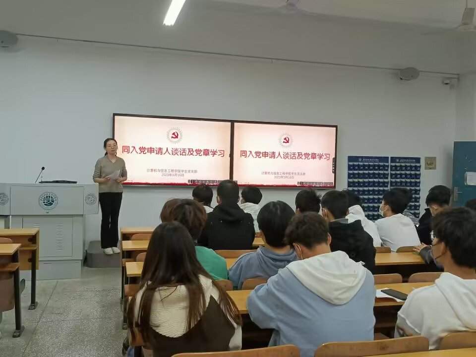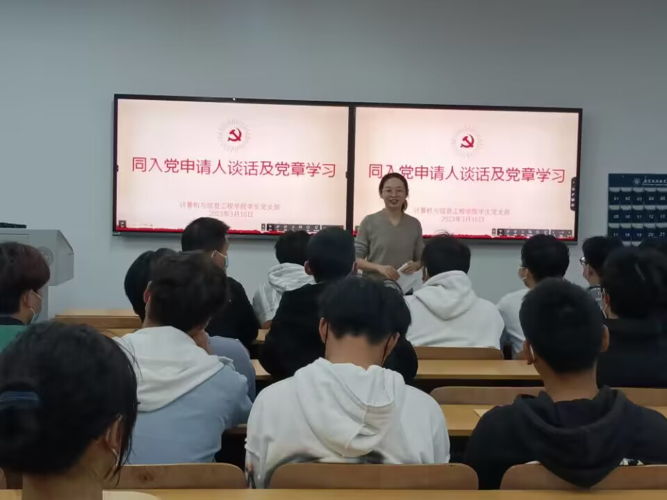 与3月16日下午,计算机信息工程学院于厚德楼208教室进行入党申请人谈话及党章学习,会议由学生党支部书记王丽主持,22级入党申请人参加。