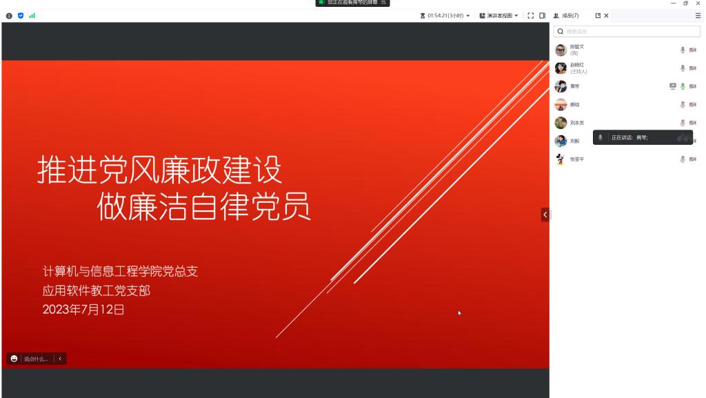 7月12日,今年会党总支应用软件教工党支部成功开展线上主题党日活动。本次活动就"加强纪律教育,培养纪律自觉"进行了深入探讨,以培养党员干部的纪律意识和规矩意识,推动清廉学校的建设,以优良的作风奋进新征程,建功新时代。