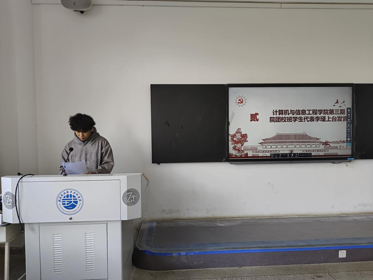 仪式在庄严的国歌声中拉开帷幕。优秀学员代表李瑾上台发言,他表示能够作为优秀学员发言倍感荣幸,在接下来的课程学习中将会与同学们一起以饱满的精神状态迎接团校班的学习。王梦婕老师简述了入团的流程,给同学们介绍了将要学习的课程。她劝勉同学们要珍惜团校班的学习机会,积极参与各项活动,把握住提升自我的机会,以严格的标准要求自己,处处发挥模范带头作用。张理武副书记针对团校班的重要性鼓励同学们力争上游,精进个人素质品德,谋求更好发展。陈雅黎同学带领团校班学员认真学习团的理论知识,帮助他们更加明确了作为共青团员的责任和使命,顺利完成了开班第一课的学习。
