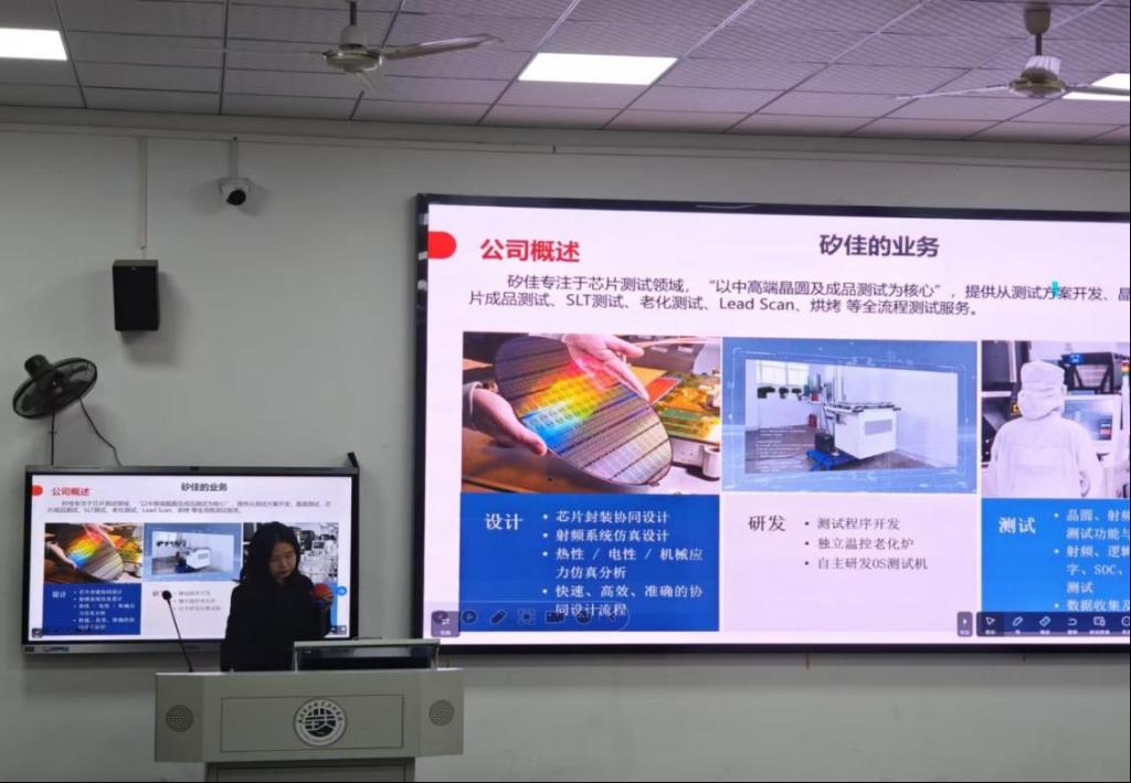 宣讲会上,矽佳企业负责人甘琴雨露全面介绍企业发展历程与行业布局,重点解读公司在集成电路测试、半导体材料研发、电子元器件生产等核心业务板块的技术实力与市场成果,展现企业深耕半导体领域的坚定定位与发展潜力,让在场学子清晰了解行业趋势与企业核心竞争力。