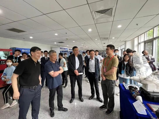 答辩展台旁,校领导与项目参赛同学进行亲切交流并给予肯定和支持。