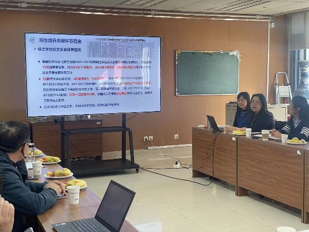 督导组副组长李妮首先就本学期的课程督导工作进行了全面总结,课程督导内容涵盖了教学计划执行情况,有无随意调停补课,教学态度、教学方法及教学效果是否达标等诸多方面。此外,督导组在研究生课程试讲、数字课程立项、卓越教学奖遴选推荐等方面也发挥了重要作用。随后,督导组副组长王薇总结了本学期督导组在研究生招生培养关键环节质量监督方面的重点工作,详细介绍了督导组开展优秀论文推荐、重点审查、格式审查及2022-2023学年博士论文全面排查整改等方面工作的具体情况。与会专家就全面提升学院研究生课程及培养质量展开了深入交流。