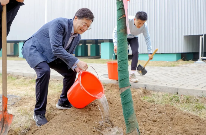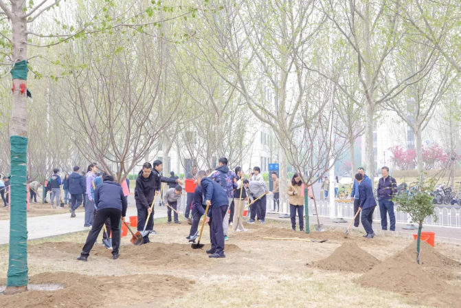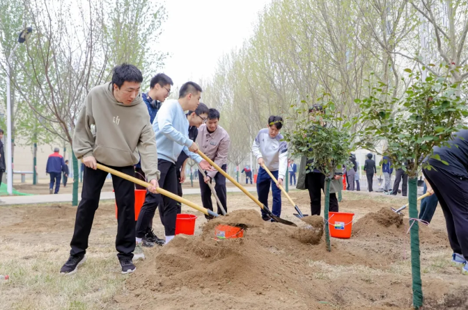 植树现场,劳动场面繁忙有序,大家挖坑、立苗、填土、浇水,合力栽下30株优质树苗,包括红枫、红梅、高杆月季等树种,为沙河校园新添一片观赏区域。