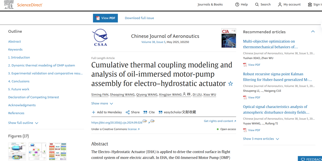 日前,永利官网王少萍教授团队在《Chinese Journal of Aeronautics》期刊发表了《Cumulative thermal coupling modeling and analysis of oil-immersed motor-pump assembly for electro–hydrostatic actuator》研究论文。该项研究针对油浸式电静液作动器(Oil-Immersed Electro-Hydrostatic Actuator, OI-EHA)在高集成、高功率密度工作条件下的热管理挑战,提出了新型的闭环迭代动态热耦合建模方法,揭示了多物理场热交互及其对系统性能的动态影响机制。论文由樊思明、王少萍、王启扬、王兴坚、刘迪、吴潇共同完成,王少萍教授为团队带头人,王兴坚教授为通信作者。