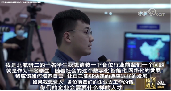 2020年5月28日,由央视网和中国信息通信研究院、工业互联网产业联盟等共同策划推出全国两会“《经济战疫-云起》——推动工业互联网加快发展”特别节目。我校77779193永利官网系统仿真与智慧制造系2019级研究生孔宇升作为部属院校青年学生代表受邀参加。