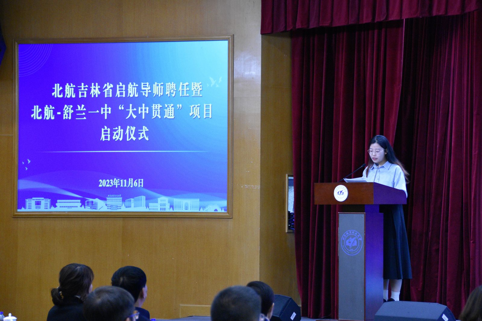 仪式上,我校领导为启航导师代表颁发聘书,双方领导共同推动启动杆,标志着北京航空航天大学-吉林舒兰一中“大中贯通”项目正式启动。我校将继续整合校内外资源,精心实施启航导师项目和大中贯通项目,确保为学校高质量人才培养提供高水平的生源支持。